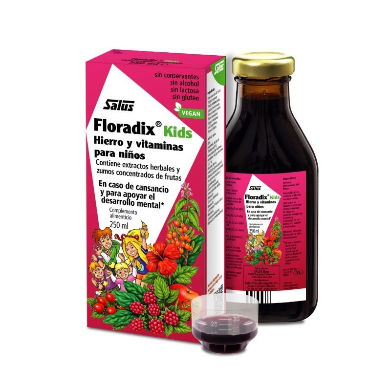 Floradix Kids se basa en el conocido Floradix y ha sido formulado para el normal desarrollo infantil. Diversos estudios reportan que niveles insuficientes de hierro apreciado en niños y jóvenes adolescentes se deben a las etapas de intenso crecimiento durante las cuales se necesita más hierro para la formación de células en general, hormonas, enzimas y para el incremento del volumen sanguíneo. Especialmente las niñas, en su fase adolescente, pueden presentar una mayor necesidad de hierro debido al inicio de la menstruación. Descenso en el rendimiento en la práctica deportiva escolar, mayor tendencia a padecer resfriados, cansancio, dificultad para concentrarse y problemas de aprendizaje pueden ser un indicador de mayores necesidades de hierro. Floradix Kids contiene gluconato ferroso, una sal de hierro bivalente de fácil absorción. Este mineral contribuye a la función cognitiva normal, a la formación de glóbulos rojos y de hemoglobina, al transporte normal de oxígeno en el cuerpo y al normal funcionamiento del sistema inmunitario. La fórmula se complementa con vitaminas del grupo B así como vitamina C natural procedente de acerola que junto con los ácidos de los jugos de fruta optimizan la absorción del hierro. El preparado tiene un agradable sabor a frambuesa.